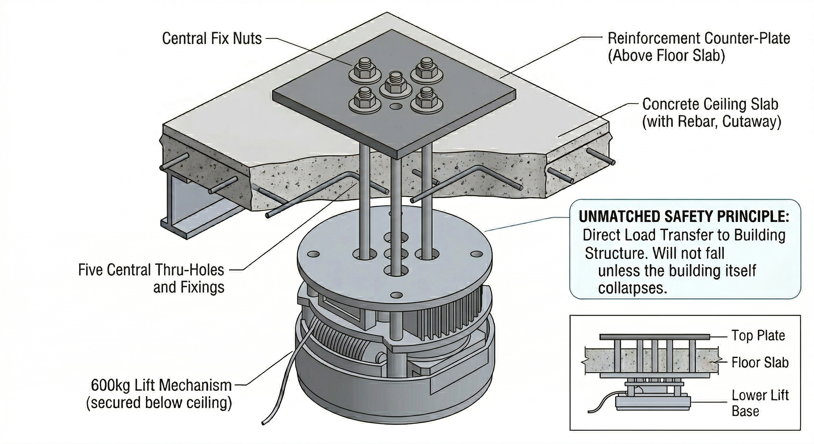 Diese Methode klemmt den tragenden Beton des Gebäudes zwischen die obere Stahlplatte und den darunterliegenden Hebezeug. Indem das System direkt im Kerngerüst des Gebäudes verankert wird, kann der Kronleuchter-Hebebühne einfach nicht fallen, es sei denn, die Gebäudestruktur selbst stürzt ein. Sie bietet risikofreies Heben für Ihre schwersten und wertvollsten Leuchten.